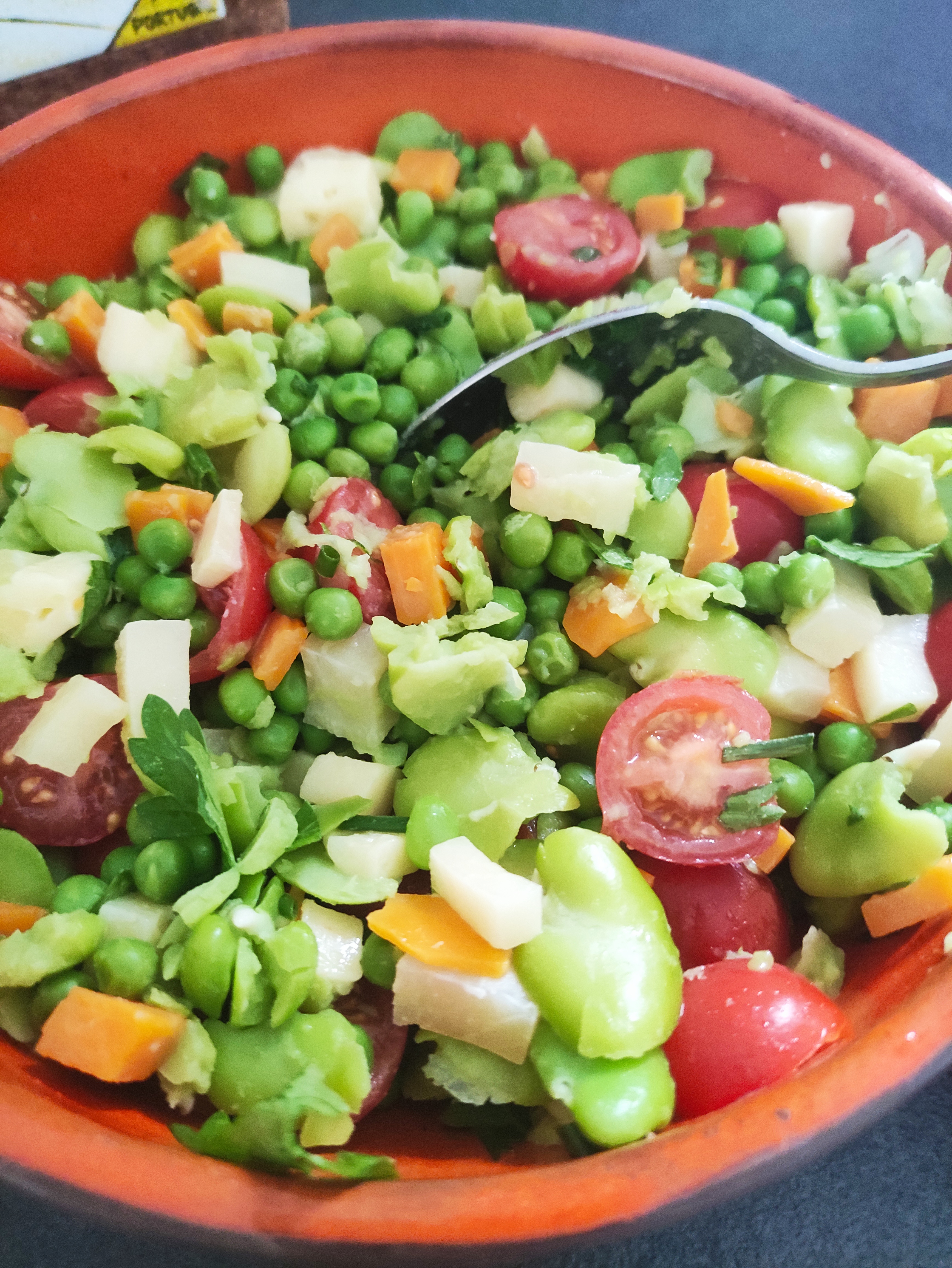 Wczorajsza, kolacyjna pora... Świeży zielony groszek, młody bob oraz mieszanka wyśmienitych serów: mimolette, tomme z Sabaudii, ementaler i troje sera koziego... pomidorki, sporo ziół i sos winegrette.